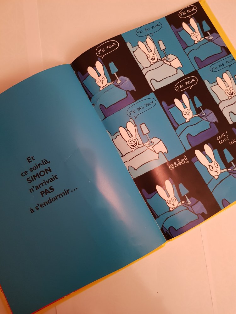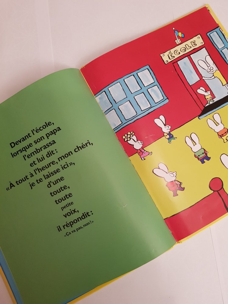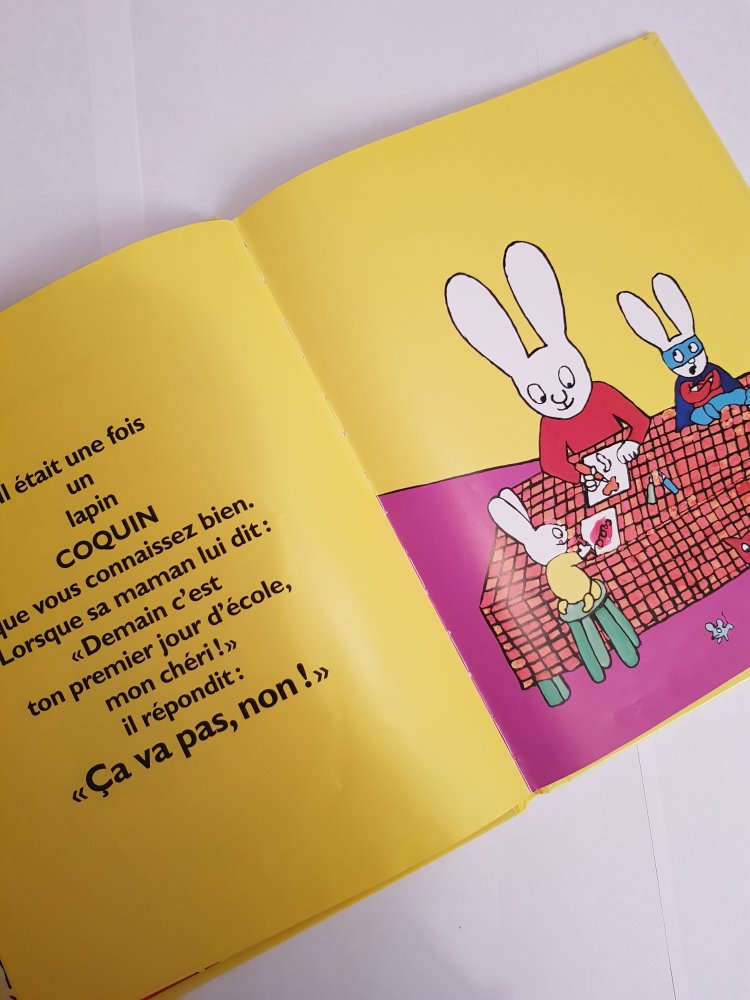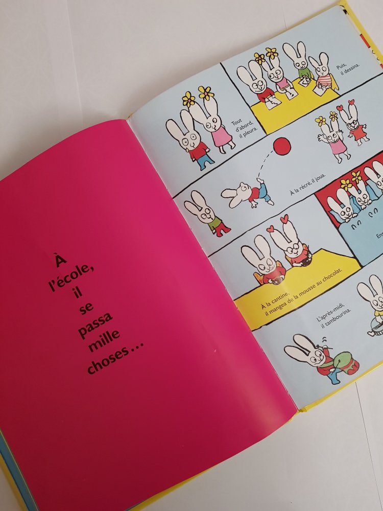 Dans cet album, c’est la première rentrée des classes pour Simon qui n’a pas envie d’aller à l’école. Bien évidemment une fois à l’école,malgré quelques pleurs, le petit lapin finit par s’y plaire et ne veut plus rentrer à la maison.