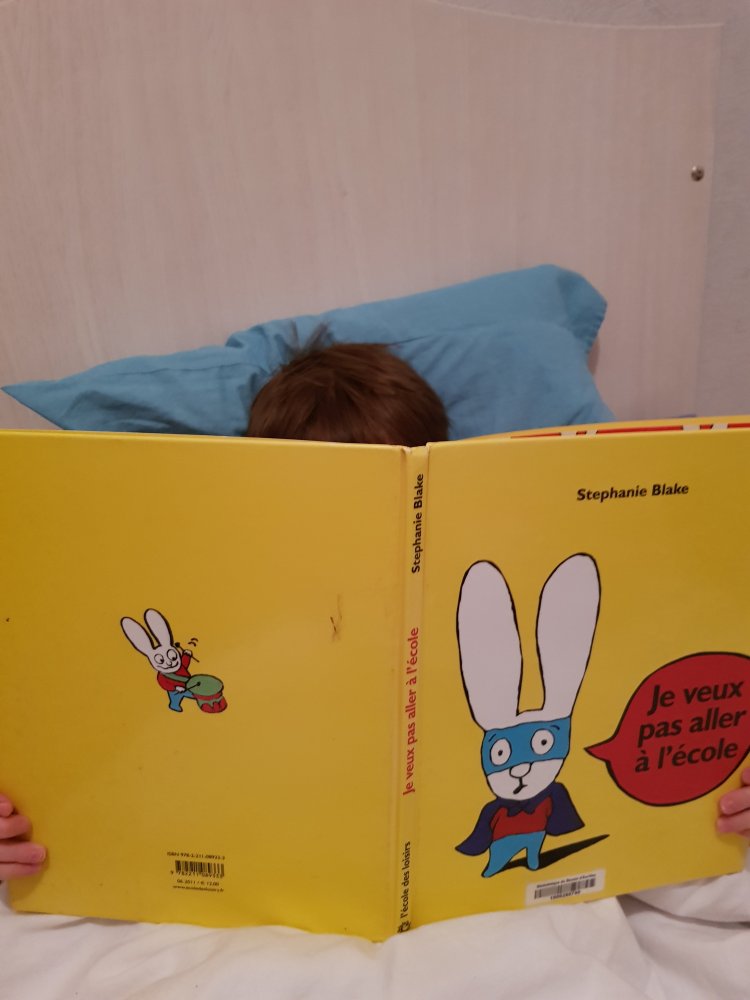 Demain c’est la reprise de l’école pour mon loulou (et oui les vacances sont déjà finies) et il n’a pas une envie folle d’y retourner. Nous avons donc opté ce soir pour une lecture de circonstance : Simon ne veut pas aller à l’école de Stéphanie Blake paru chez l’école des loisirs. Mon fils est un grand fan du lapin Simon et j’aurai l’occasion de vous présenter d’autres livres de cette collection.
