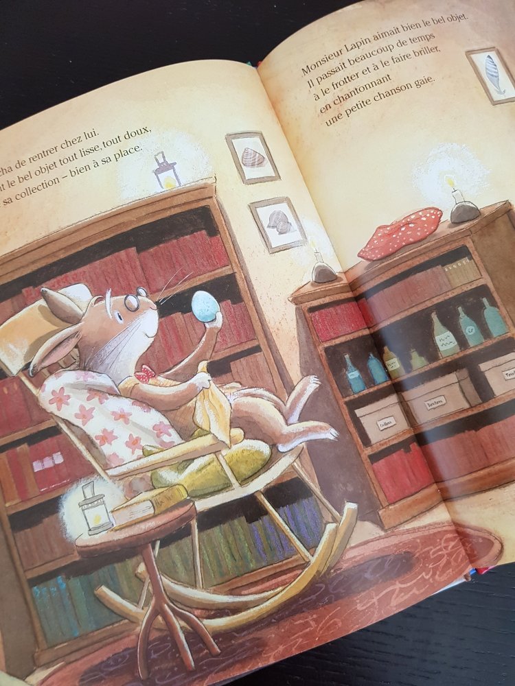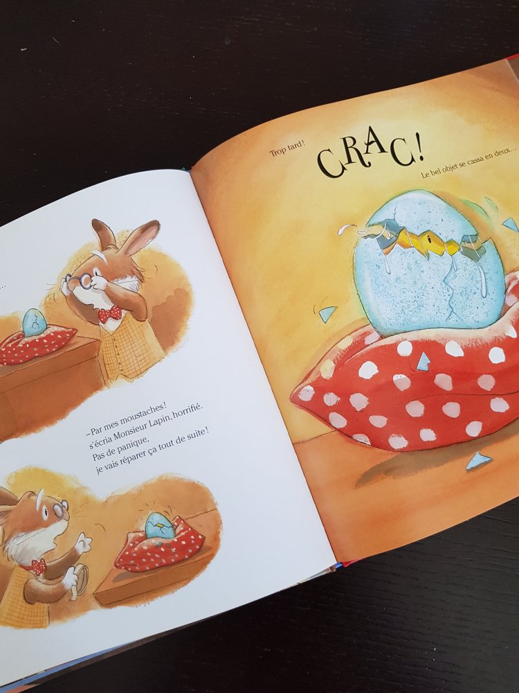Pour une fois je ne vous en dirai pas plus sur la suite de l’histoire que j’espère vous irez découvrir car il en vaut vraiment la peine. C’est un album grand format qui peut être lu dès l’âge de 3 ans. Les illustrations sont vraiment toutes douces et rassurantes. Mon fils trouve Mr Lapin trop mignon et adore sa réplique favorite « par mes moustaches! ».