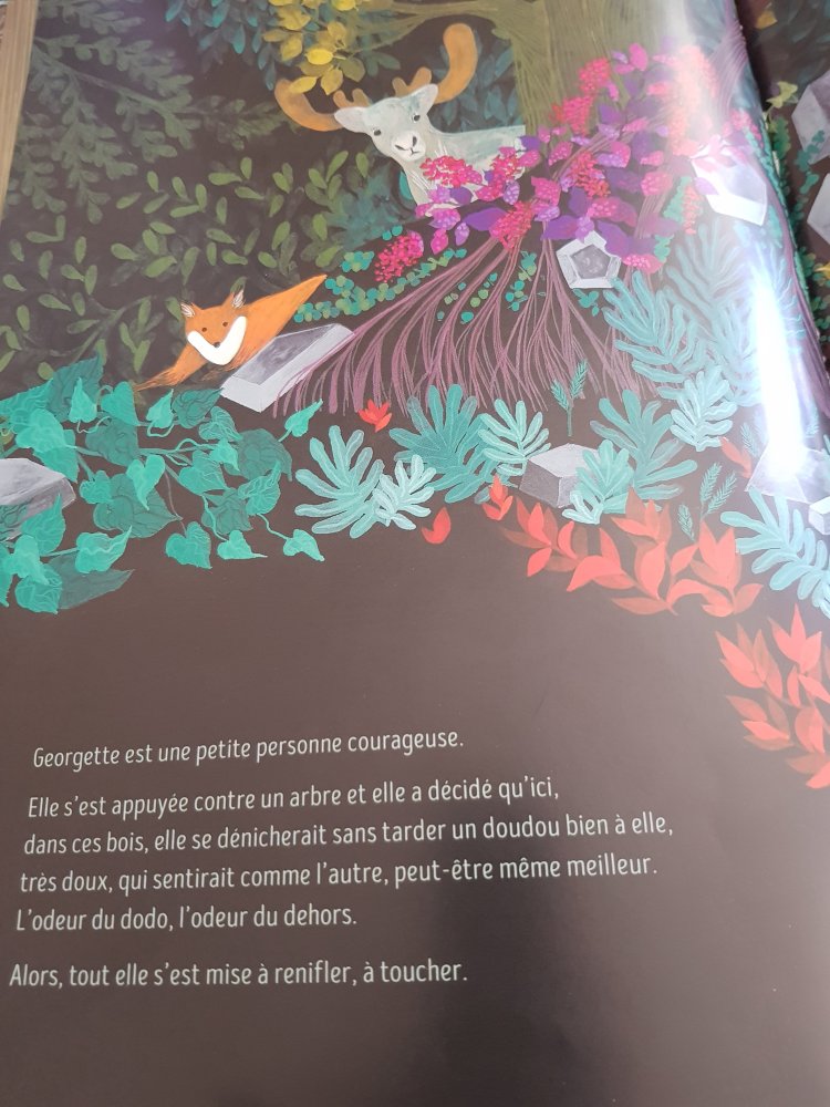 Dans cette histoire « Georgette part se promener dans les bois. Ça sent bon la terre, la pluie, les champignons. Elle installe don doudou sur un lit de feuilles. Elle admire les belles couleurs de la forêt…Mais le soir se couche et il lui manque quelque chose: elle a oublié son doudou! Là bas tout seul sous le grand noir du ciel! Et le lendemain de retour sur les lieux, impossible de le retrouver. Courageuse et volontaire Georgette s’entête. Elle cherche l’odeur perdue du dodo dans ce grand dehors… »