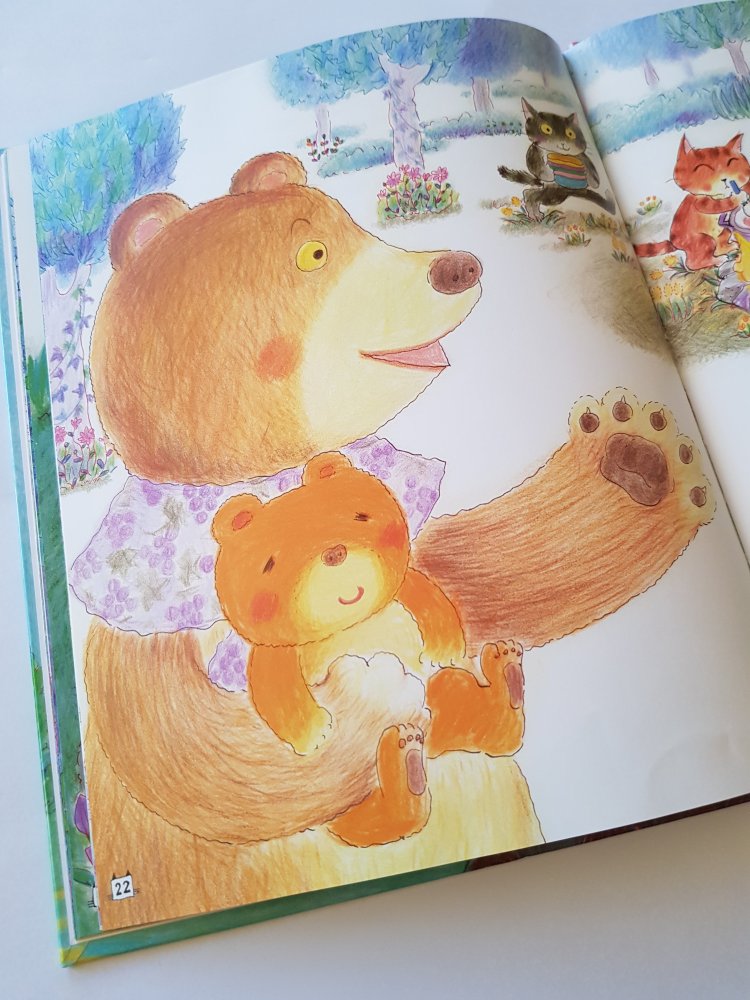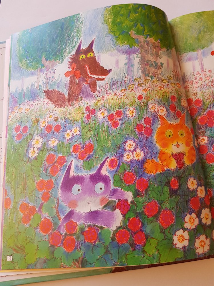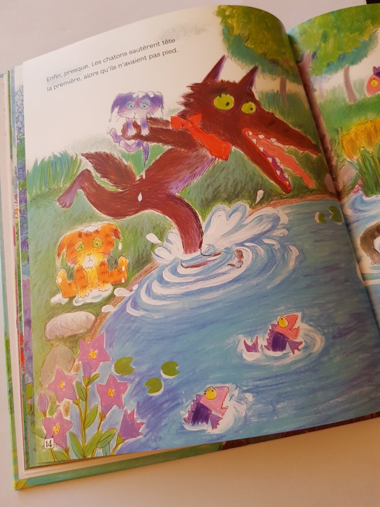 Dans cet album ce qu’on a beaucoup aimé c’est que le loup a un rôle qui sort de l’ordinaire. Loup est en quête de nourriture mais il sera finalement pris a son propre piège. C’est une histoire pleine d’humour, aux illustrations très colorées. Les illustrations sont dessinées à la craie grasse ce qui, je trouve donne un style très original et reconnaissable à cet album.