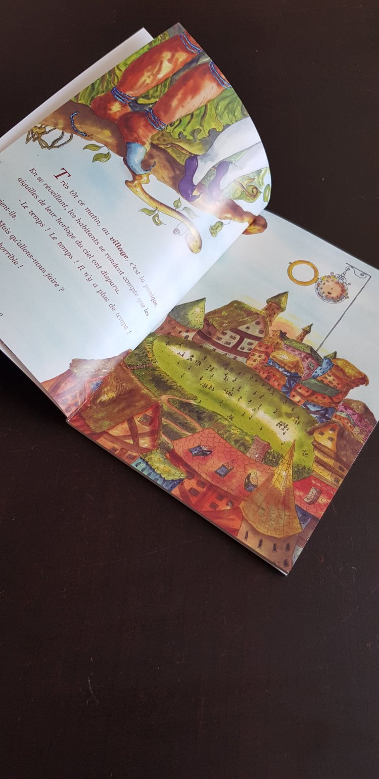 « Au village c’est une belle panique ce matin. Les habitants se rendent compte que les aiguilles de leur horloge du ciel ont disparu! Luciel et Marie-Kitty, lutins veilleurs de notre monde, vont se charger de retrouver le temps. »