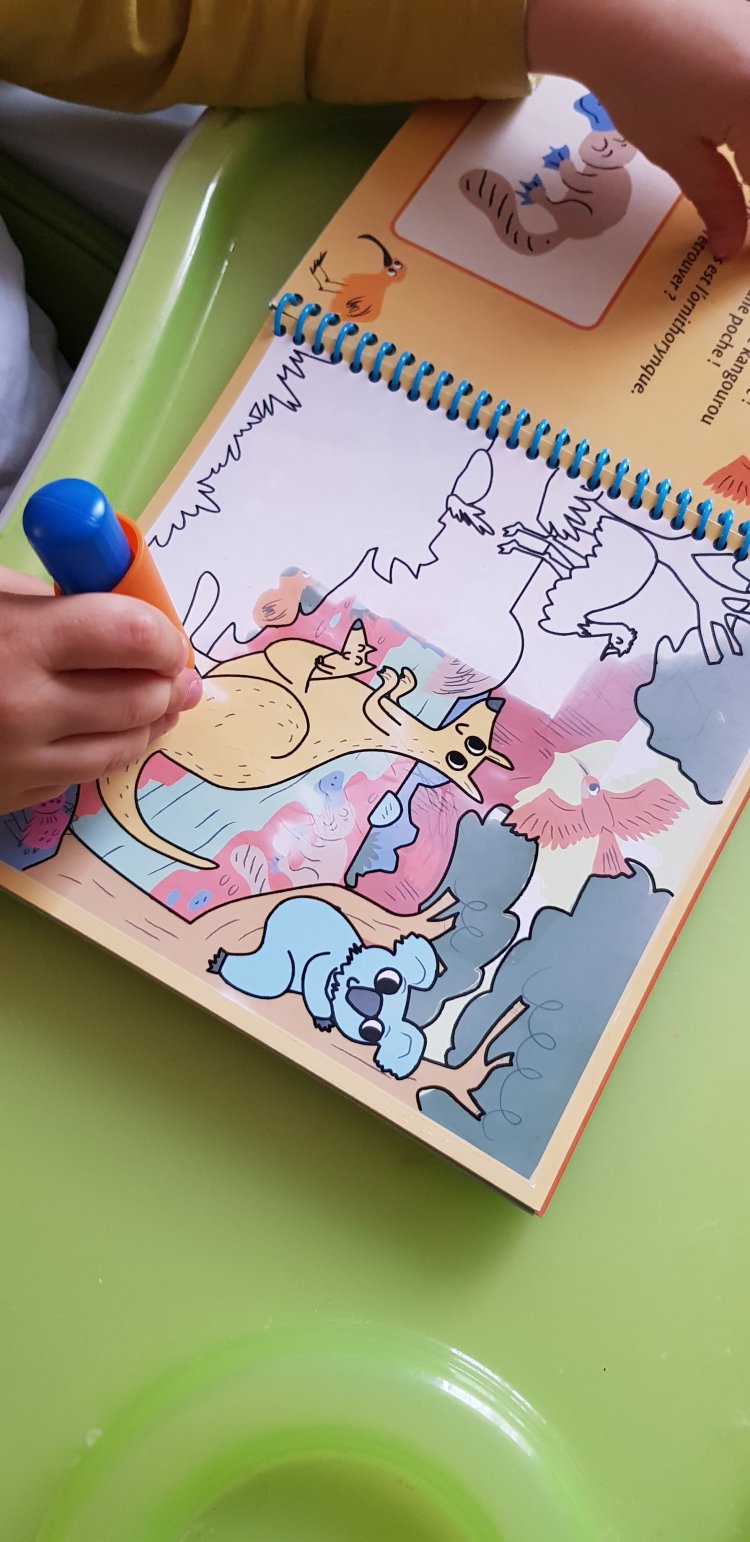 Faire de la peinture sans se salir et que l’on peut emmener partout le top. D’ailleurs ces livres ont rencontré un franc succès chez mes enfants et même chez le plus grand de 5 ans. Et en plus, une fois le coloriage terminé il pourra être refait à l’infini.