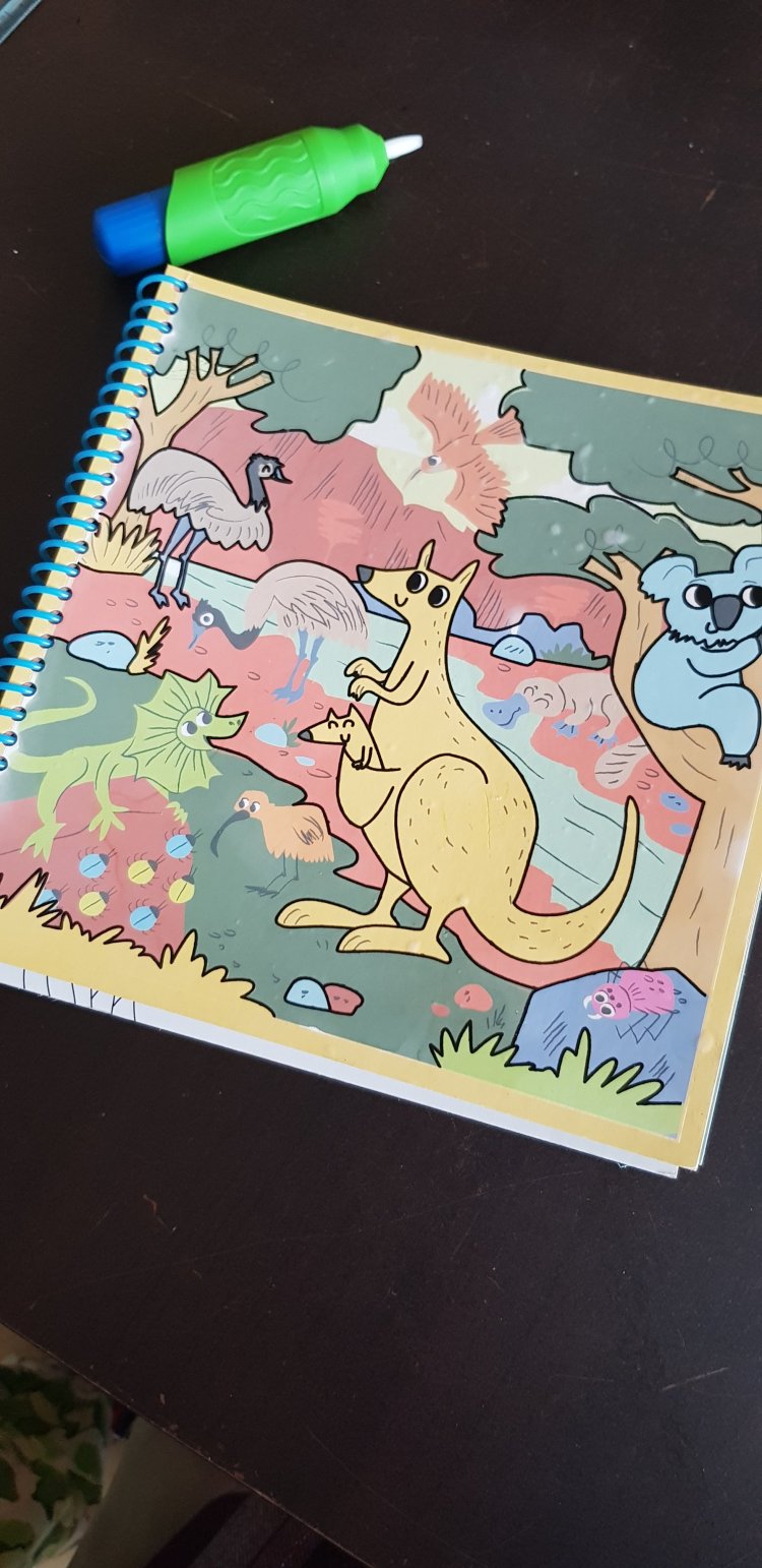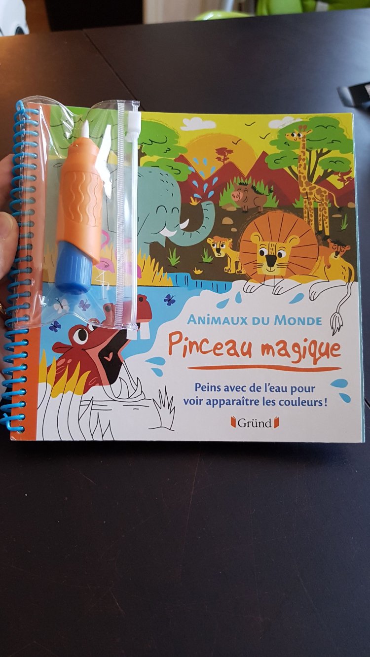 Ils sont magiques car vous avez un pinceau que vous remplissez d’eau. Lorsque l’enfant passe le pinceau sur les pages du livre les couleurs apparaissent.