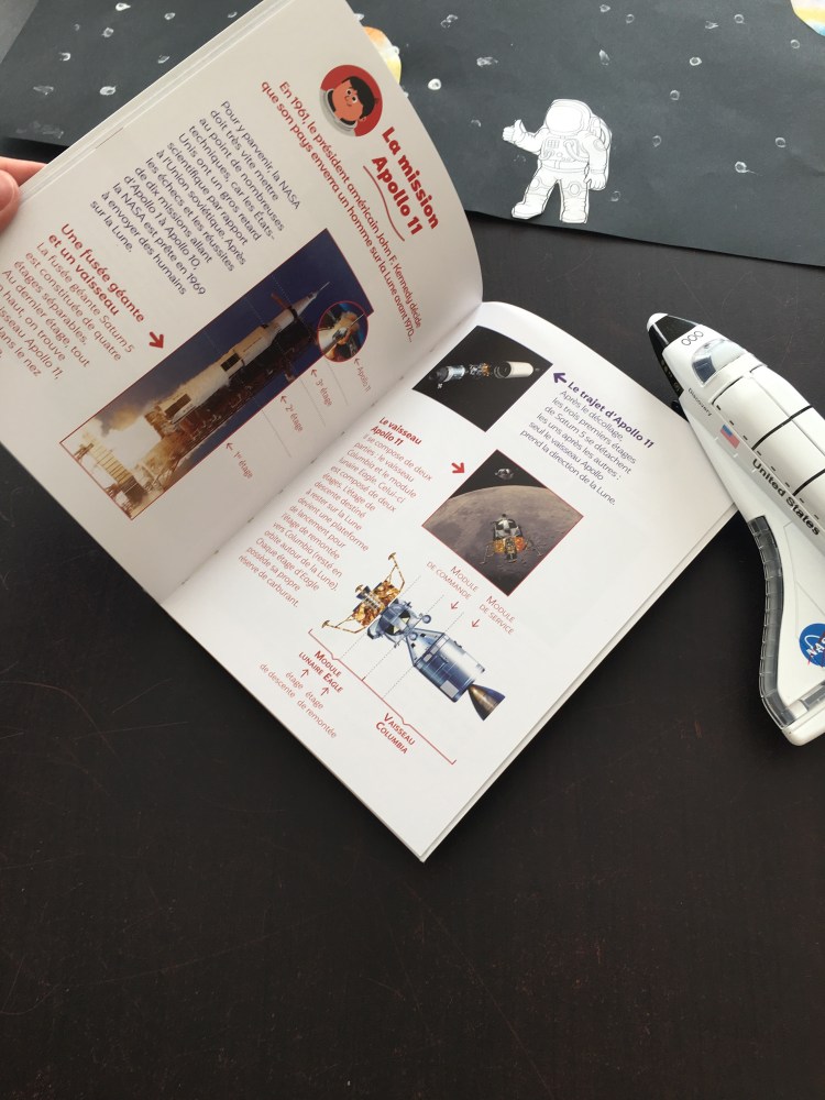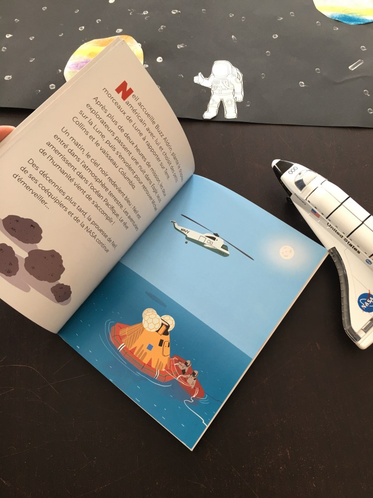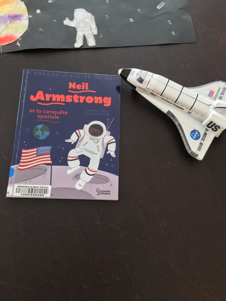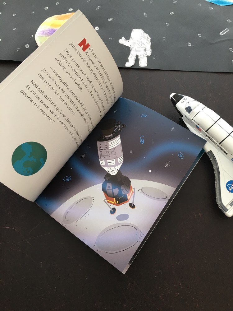 Du coup j’étais ravie de trouver ce petit livre à la bibliothèque. Il s’agit de Neil Armstrong et la conquête spatiale publié chez Larousse jeunesse . Il s’agit d’une collection qui s’intéresse aux grands personnages historiques . Ainsi la vie de Neil Armstrong nous ai raconté sous forme d’histoire et à la fin du livre on retrouve quelques pages documentaires.