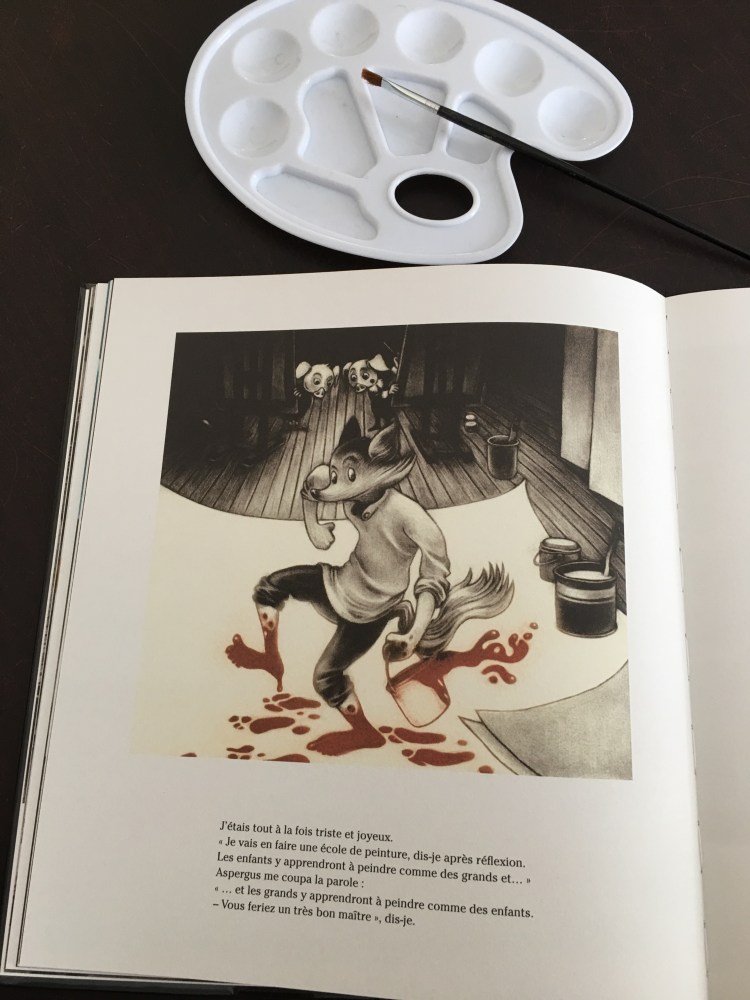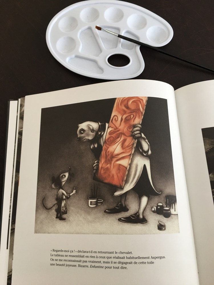 trente assistants du fameux peintre de célébrités, Franz Aspergus. C’est lui qui est chargé de préparer les noirs, si pauvre qu’il dort dans l’atelier, sous l’établi. Mais voilà que le vieux maître perd le goût de peindre. Il aimerait tant retrouver la fraîcheur de l’enfance ! Une nuit, le petit broyeur de noirs lui propose d’essayer de peindre de la main droite, lui qui est gaucher… Révélation !
