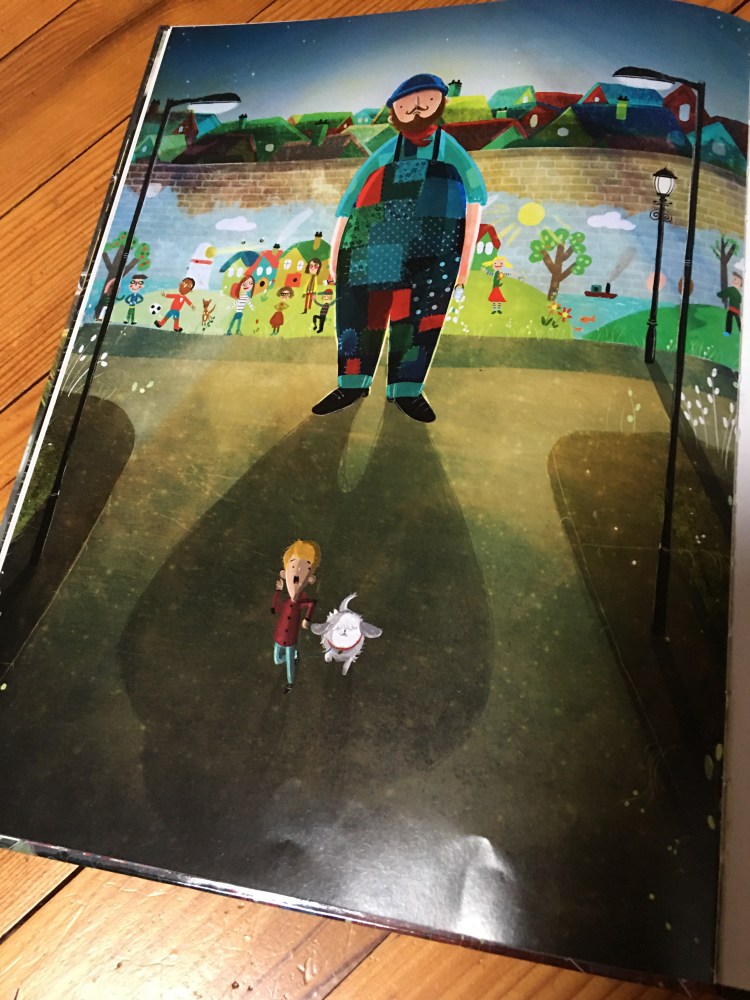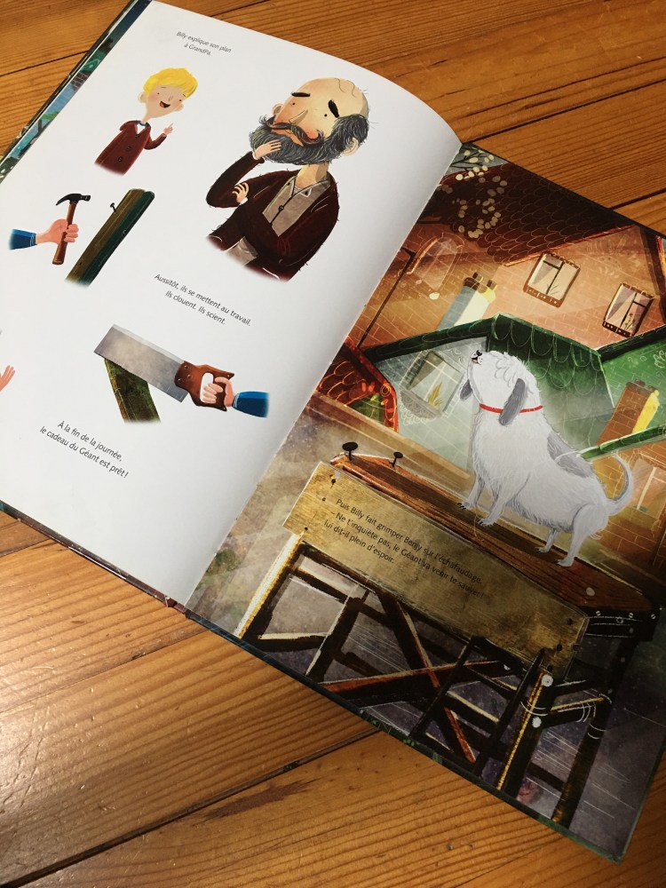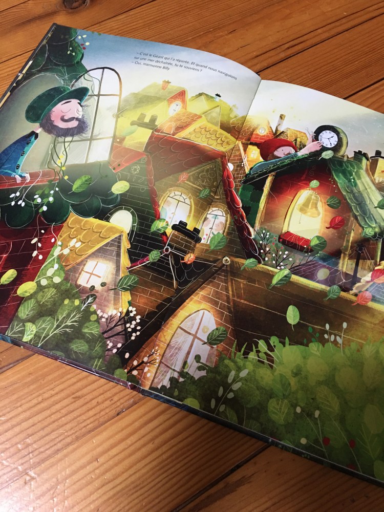 « Ses mains sont aussi larges qu’une table, ses jambes sont aussi longues qu’une échelle et ses pieds aussi grands qu’une barque. Voyez-vous de qui je parle ? Du Géant, bien sûr. Celui qui veille sur le village de Billy. Son grand-père lui en a parlé des milliers de fois : qui a sauvé le grand chêne de la tempête ? Qui a réparé l’horloge du village ? Qui a aidé Benjy le chien à descendre du toit ? C’est le Géant !