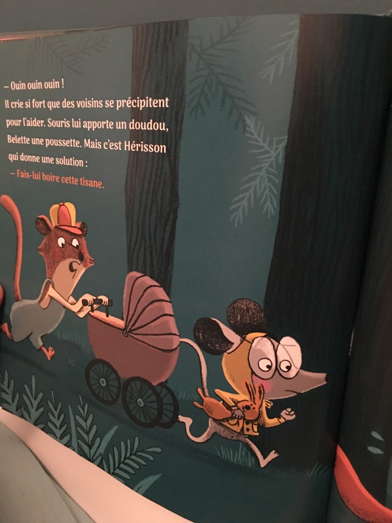 Les illustrations sont vraiment toutes mignonnes. L’histoire quant à elle parlera je pense à bon nombres de parents. Les situations dans lesquelles se retrouvent Papa Écureuil sont à la fois tendres et amusantes. Ce que j’ai beaucoup aimé dans cet album c’est que c’est le papa qui passe toute la nuit avec son tout petit. Ça change des stéréotypes que l’on peut souvent trouver dans certains albums, où c’est toujours la maman qui a ce rôle .