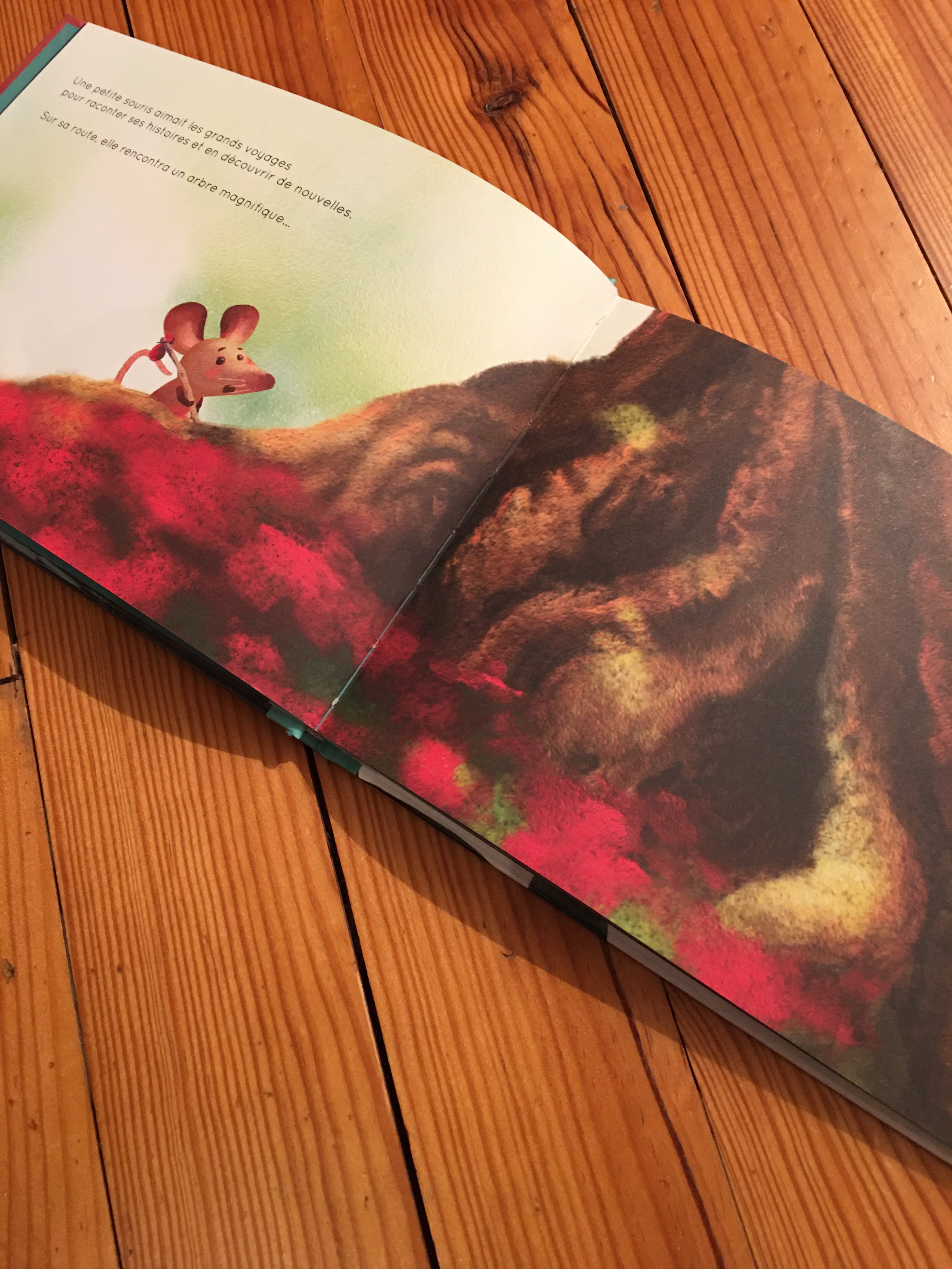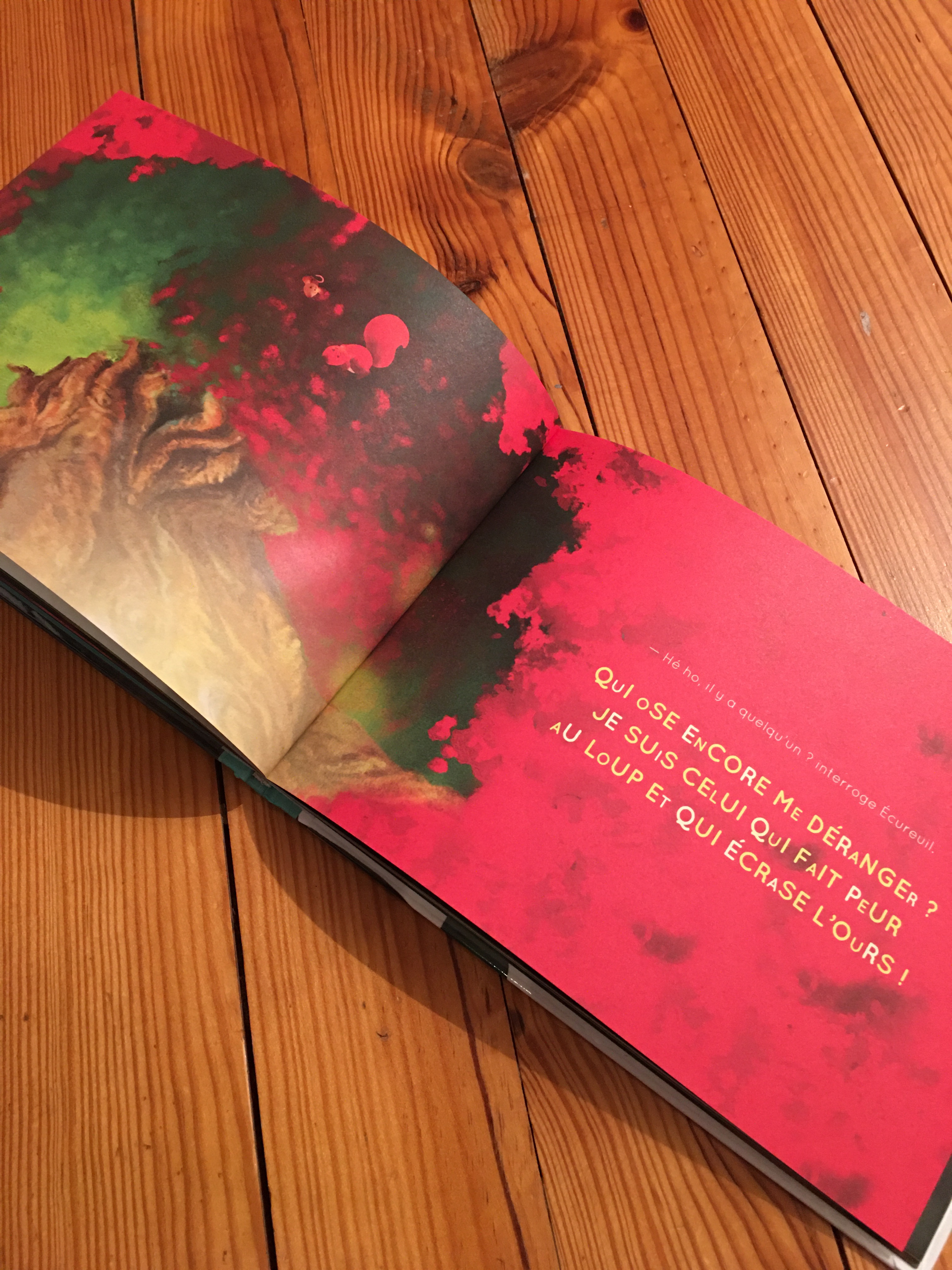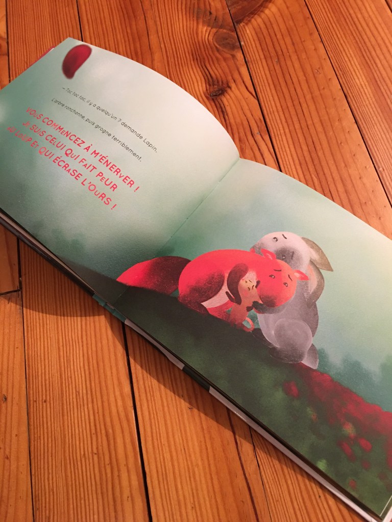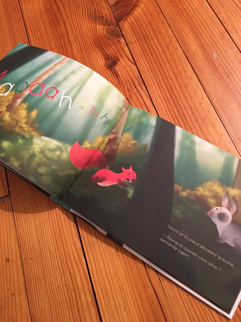 Cet album a rencontré un franc succès à la maison. Comme bien souvent dans les albums jeunesse, ce qui a le plus fonctionné avec les enfants c’est la structure répétitive de l’histoire. On va suivre différents animaux qui à tour de rôle vont se retrouver dans une situation de peur face à l’inconnu. Quel est le mystère de cet arbre à grosse voix?