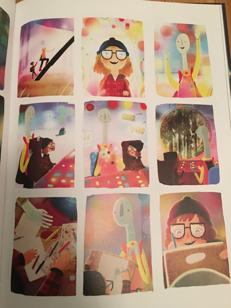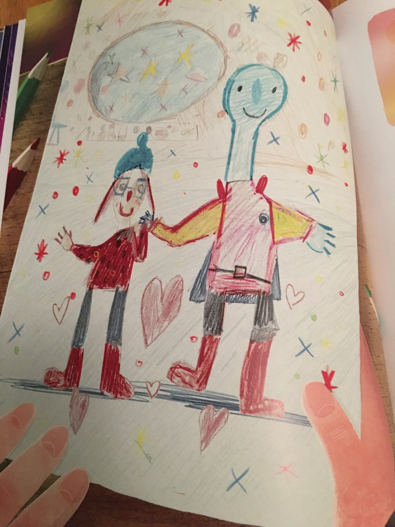 L’histoire quant à elle peut surprendre par rapport au titre de l’album. J’avoue l’avoir choisi au départ pensant qu’il traitait du thème de l’espace, mon fils en étant fan. Or , il s’agit de l’histoire de Lucie qui rêve de rencontrer des extra terrestres. Mais elle se rend compte que même si elle arrive à réaliser son rêve , il y a encore quelque chose de plus important pour elle: sa famille. Le message est vraiment très beau, très touchant.