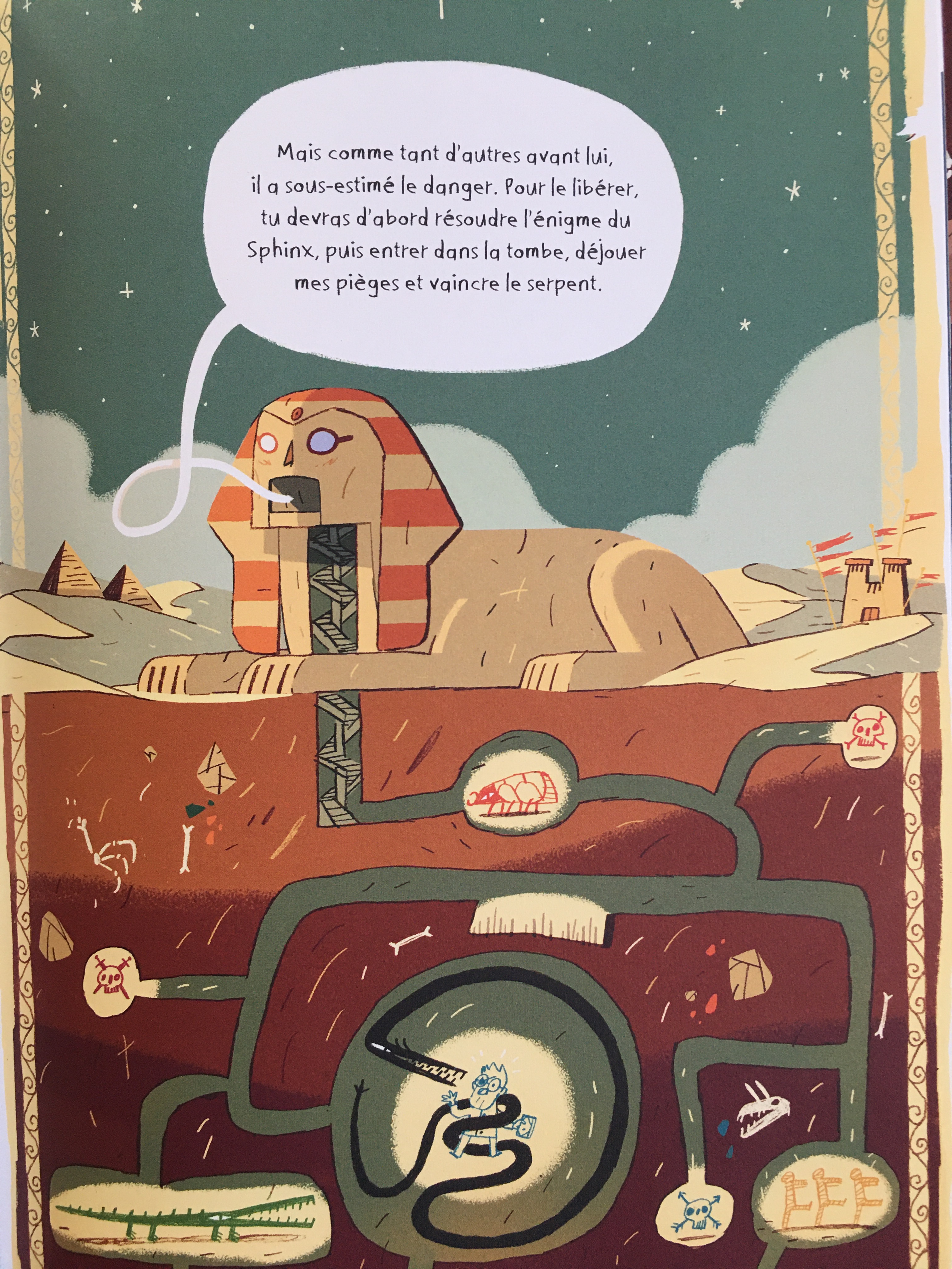 Ce livre nous a énormément plu. Déjà ce livre est un mélange entre l’album classique et la bande dessinée. L’histoire est très bien ficelée car elle permet d’aborder plein de thèmes comme par exemple celui de surmonter ses peurs, mais il aborde bien évidemment le thème de l’Egypte , de la mythologie. L’histoire prend vraiment l’aspect d’un parcours initiatique où Lucie essaiera de vaincre ses peurs et d’avoir d’avantage confiance en elle.