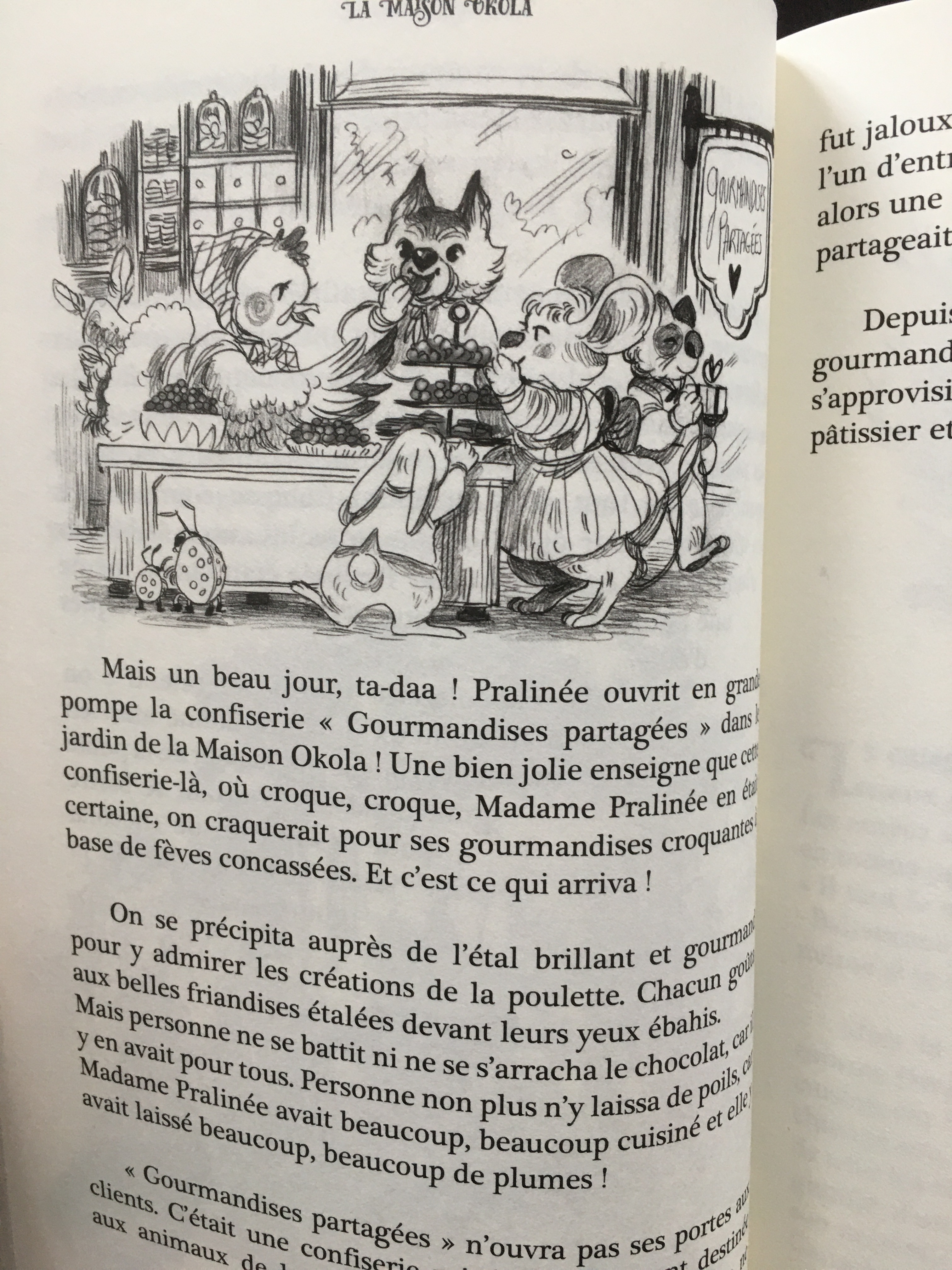 Ce livre est un condensé de petits contes gourmands et adorables. Il comporte dix petits contes relativement courts sur la vie de la chocolaterie Okola et des habitants du bourg. J’ai adoré le format du livre qui est légèrement plus grand qu’un roman mais qui n’est pas non plus un album. C’est un livre parfait pour les jeunes lecteurs qui pourront faire le choix de ne lire qu’un seul conte . Et en plus les illustrations sont superbes .