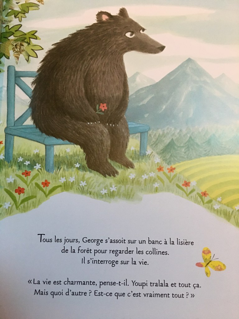 « George est un ours brun qui ne se résout pas à vivre sa vie d’ours. Pêcher, jouer, toujours raconter les mêmes histoires… Est-ce là tout ce qu’il y a à faire ?Un jour, lors d’une promenade, George trouve un livre… Dès lors, il n’a plus qu’une obsession : apprendre à lire. Il part pour la ville, décidé à retrouver le propriétaire de l’ouvrage malgré les mises en garde de ses frères et soeurs qui lui affirment qu’un ours, ça ne lit pas.Sa rencontre avec Clémentine, une petite fille passionnée de lecture, va bouleverser sa vie. »