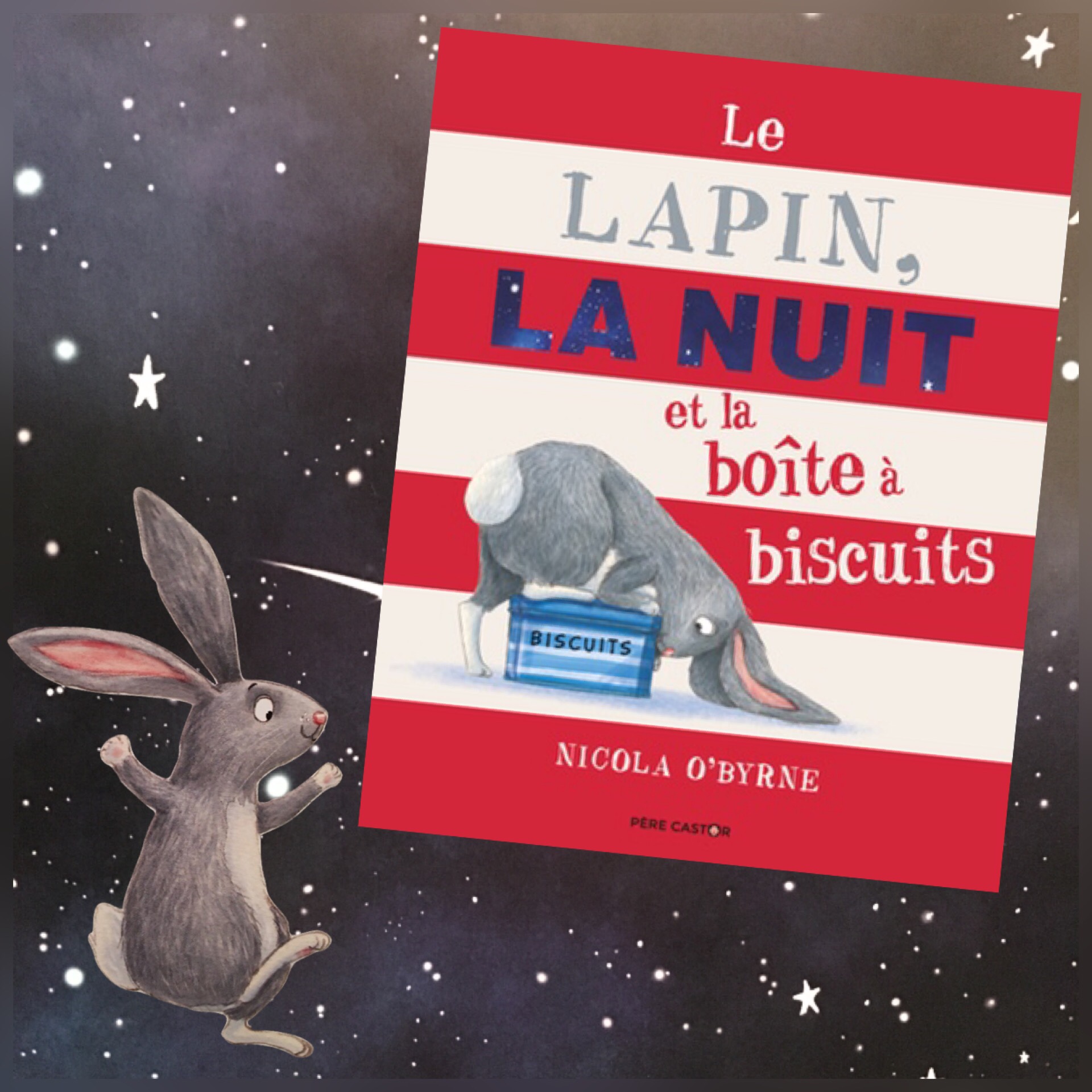Je pense qu’en tant que parents nous avons tous déjà entendus cette phrase de la part de nos enfants « j’ai pas sommeil! Suis pas fatigué. Je veux pas dormir! ». C’est exactement ce qu’aborde l’album Le lapin la nuit et la boîte à biscuits de Nicola O’Byrne et Rose-Marie Vassallo publié aux éditions Flammarion dans la collection Père Castor .