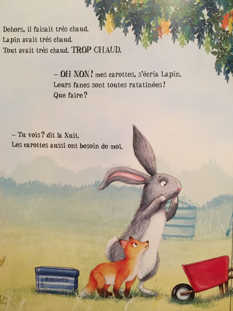 Cet album traite magnifiquement de la nécessité de la nuit et démontre toute la beauté de la nuit. J’ai adoré les illustrations que je trouve tellement mignonnes . Le personnage du lapin est très drôle, tout comme l’histoire. Ce petit lapin grognon, têtu qui ne veut pas aller se coucher va apprendre que la nuit est nécessaire pour la nature et pour bon nombres d’animaux .