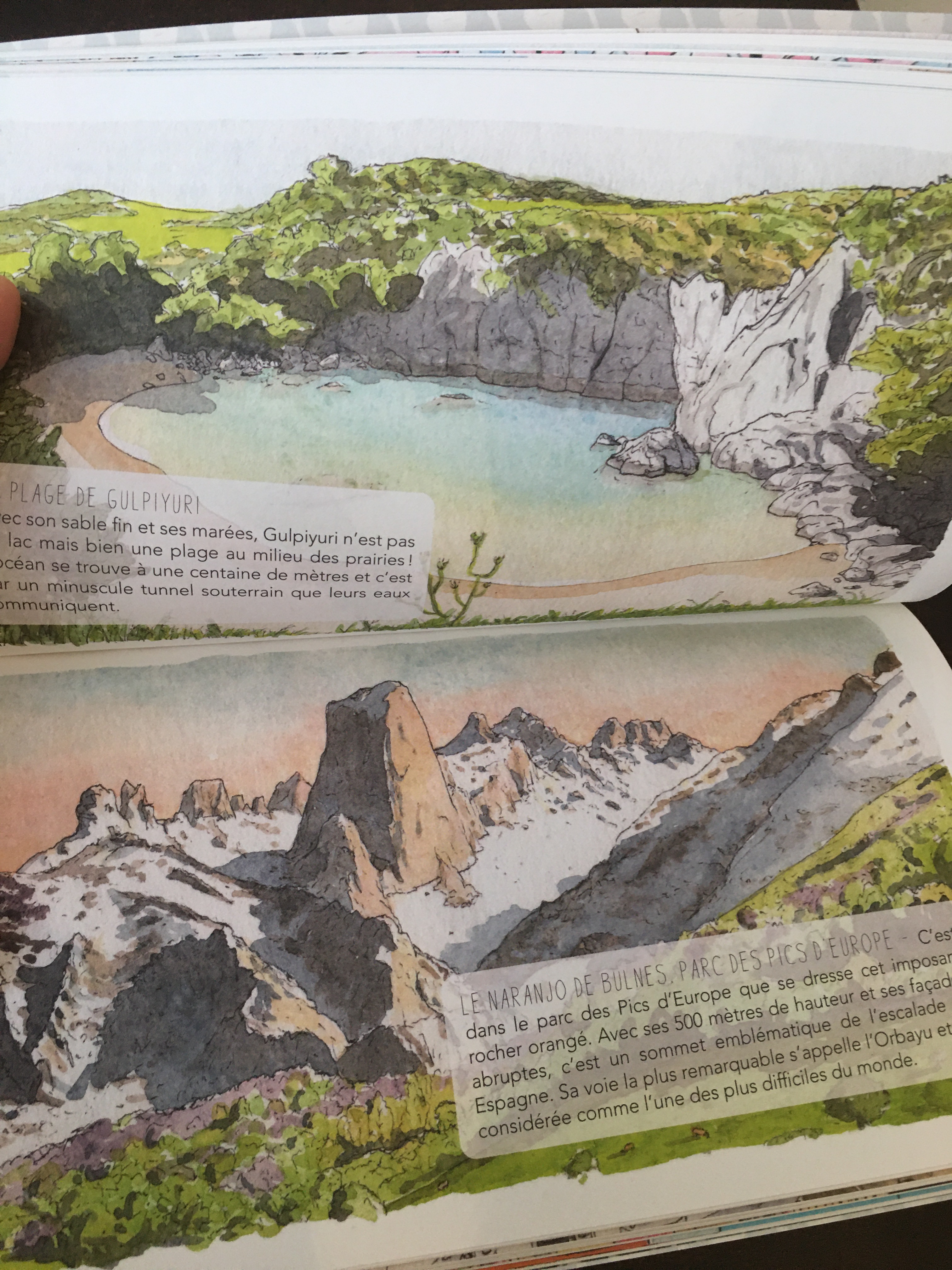 Ce livre est une magnifique découverte et un énorme coup de cœur. Déjà j’ai adoré les illustrations tout en aquarelle du livre . C’est une technique de dessin cher à mon cœur et je trouve qu’ici les aquarelles mettent en valeur les paysages espagnoles . C’est à la fois chaleureux et délicat. J’ai également adoré le format italien du livre qui change nos habitudes de lecture.