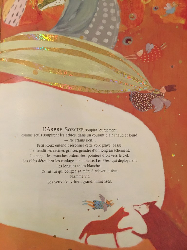 « Au centre d’une clairière trône un arbre magnifique, un arbre qui parle, qui raconte des histoires, qui apaise… Un arbre sorcier. Un soir, Flamme, une renarde blessée par un braconnier, et Petit Roux, son renardeau, viennent trouver refuge parmi ses racines. Flamme est si terrorisée qu’elle n’entend pas l’arbre lui parler, qu’elle ne voit ni les Elfes ni les Sylvains tresser des cordages… Elle veut que Petit Roux prenne la fuite, échappe à l’homme qui les poursuit. Finalement, les branches s’étirent, les cordages, les voiles se mettent en place, et l’arbre prend son envol, tel un bateau naviguant entre les nuages… »