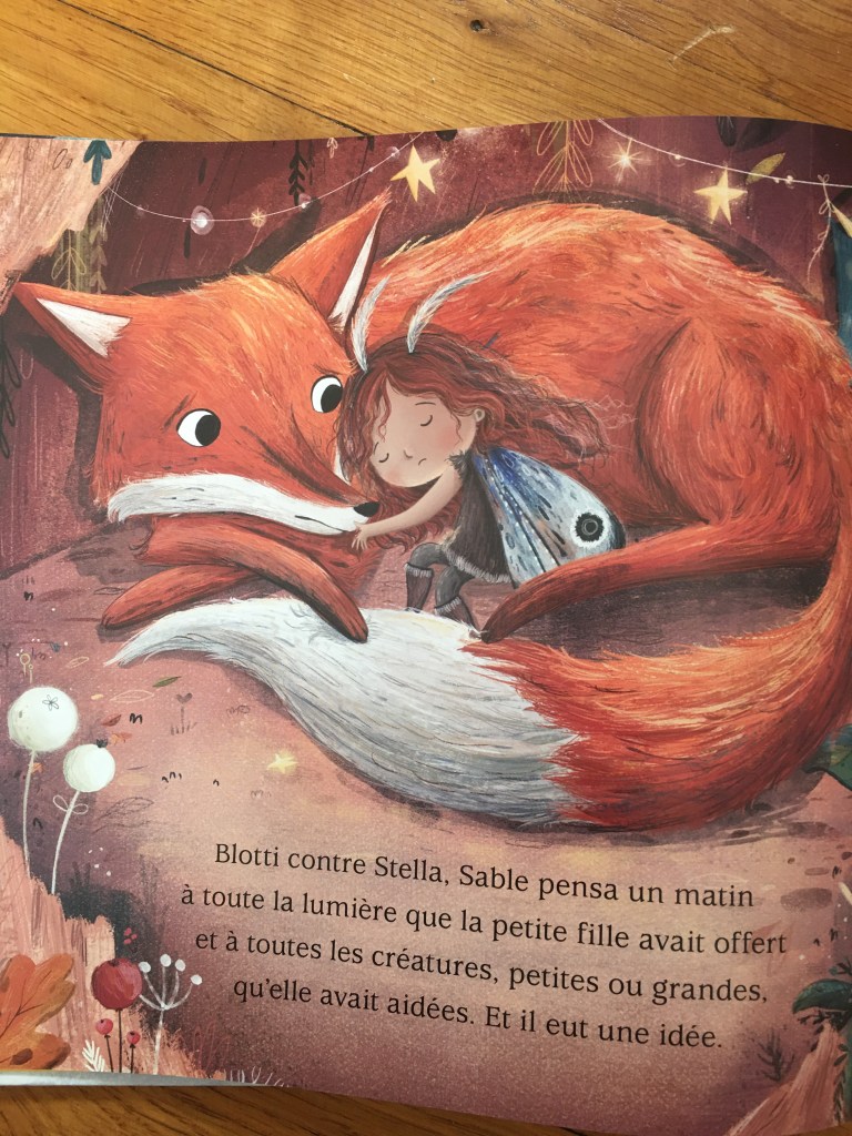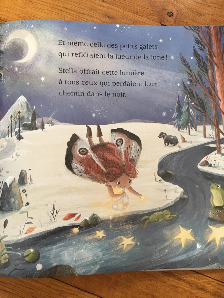« Stella, une petite fille aux ailes de papillon, vit nichée au creux d’un vieux chêne.Elle rêve d’admirer le lever du soleil, mais elle ne peut sortir le jour à cause de ses ailes délicates et fragiles.Chaque nuit, Stella collectionne les lumières qui brillent dans le noir (reflets de la lune, lumière des étoiles filantes…) et offre ainsi un peu de chaleur et de douceur aux animaux apeurés qu’elle rencontre dans l’obscurité. Un jour, les animaux qu’elle a aidés décident de l’aider à leur tour à réaliser son rêve :ils construisent une cape avec un bout de nuit étoilée, qui permet à Stella d’assister aux levers du soleil en toute sécurité. »