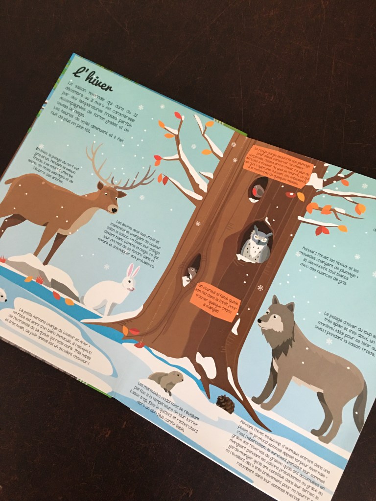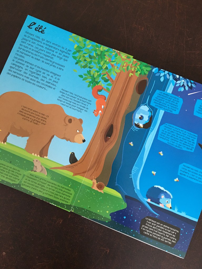 En ce qui concerne le contenu vous retrouvez sur chaque double page une saison. Vous y retrouvez pas mal d’informations sur la faune et la flore et même mon plus grand qui a 7 ans a appris de nouvelles choses .