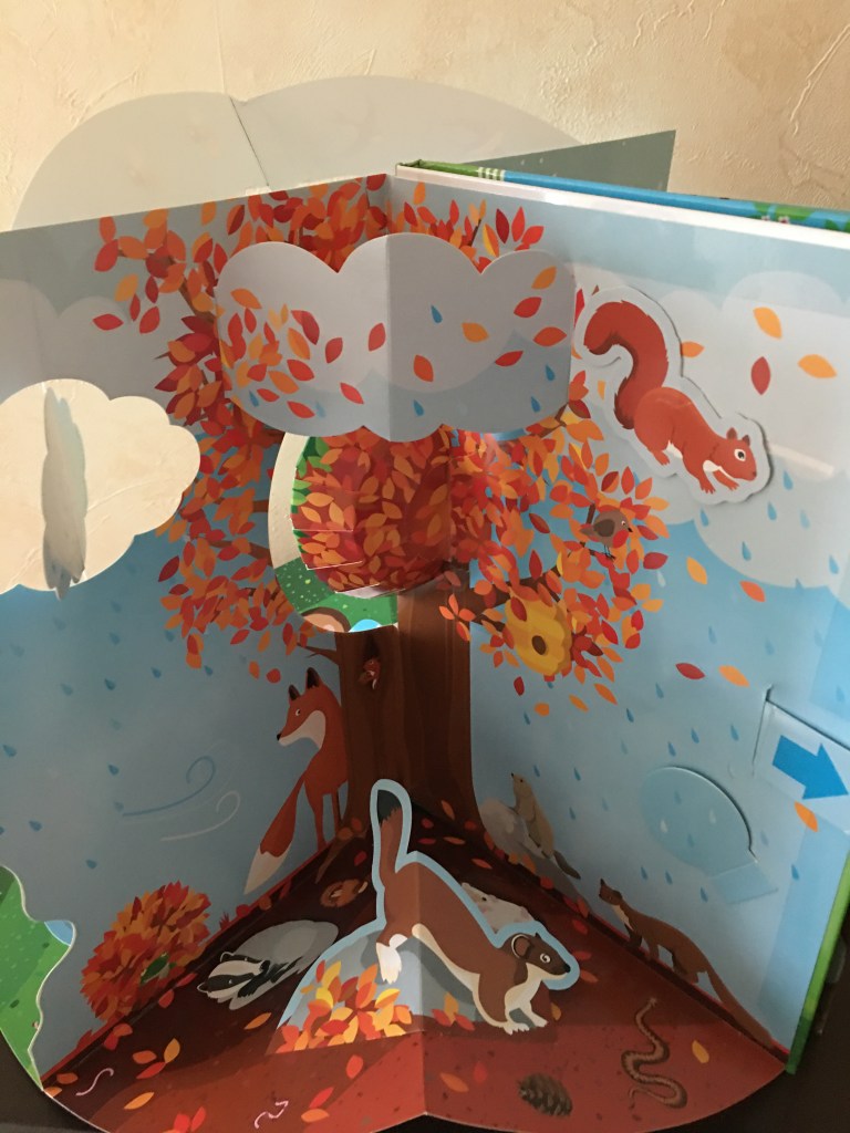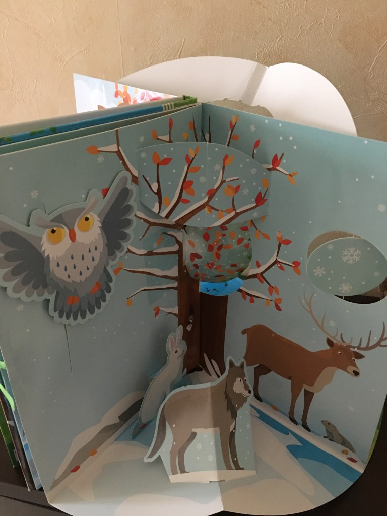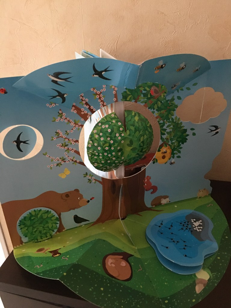 Bien évidemment la grande originalité de ce livre est qu’il s’ouvre à 360 degrés pour laisser apparaître un arbre des saisons. Les enfants en étaient tout émerveillés. Ce que j’ai adoré c’est que sur le pop up même l’enfant va pouvoir faire tourner un nuage , faire bouger la chouette, soulever des rabats … c’est vraiment très ludique en plus d’être très beau .