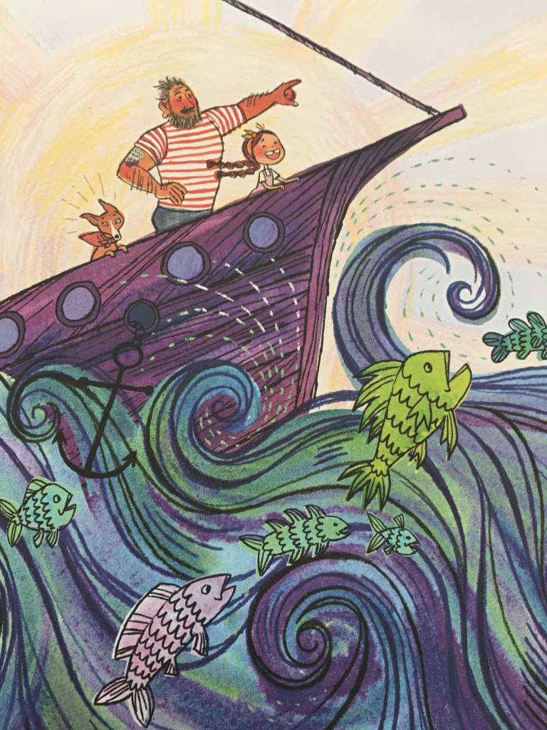 Nous avons beaucoup aimé la lecture de cet album. J’ai adoré l’histoire qui bouscule les préjugés et les stéréotypes . Pourquoi un pirate serait il forcément un garçon? Cet album amène à la discussion avec les enfants et c’est ce que j’adore. La relation du grand père avec sa petite fille est vraiment très touchante.