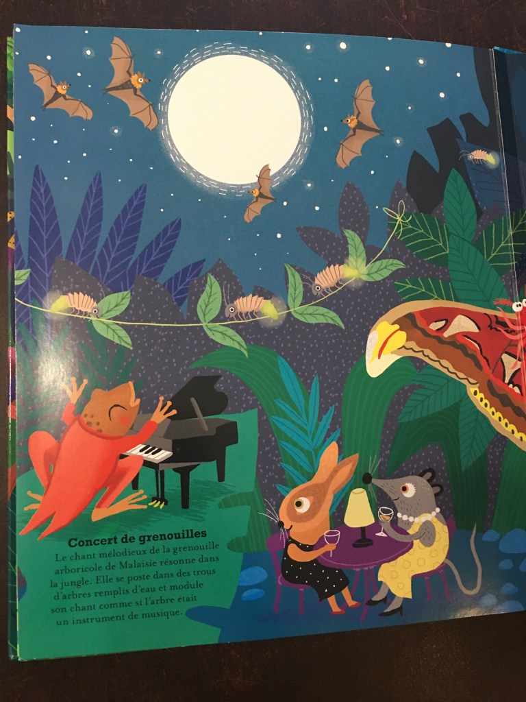 Dans cet album documentaire on est totalement plongé dans l’univers coloré de la jungle. On y découvre six habitats différents ainsi que la faune et la flore qui y résident.