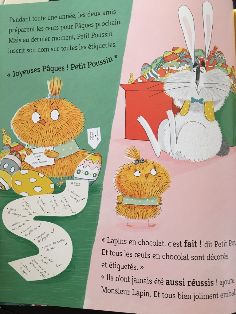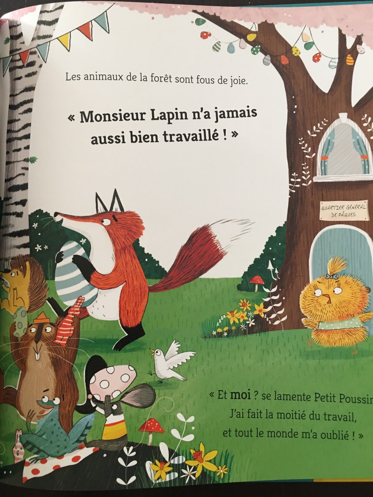 L’album est coloré, pétillant. Nous avons beaucoup aimé cet histoire avec ce Petit Poussin qui agit dans l’ombre de Monsieur lapin et qui est tellement mignon et attachant. Les illustrations sont très riches et modernes.
