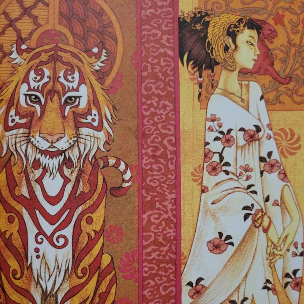 Il s’agit d’un conte classique du 18eme siècle qui nous fait de suite penser au conte de La Belle et la Bête.Or ici contrairement au conte de Mme Leprince de Beaumont il n’est nullement question de métamorphose puisqu’il s’agit d’un vrai tigre. A travers ce conte l’auteur traite des thèmes de l’amour et du dévouement. J’ai trouvé l’histoire extrêmement belle et touchante. Mon plus grand a même eu les larmes aux yeux . Comme toute belle histoire d’amour ce conte est très poignant. Les illustrations d’Agata Kawa sont juste sublimes et nous plongent immédiatement en Chine. Les couleurs chaudes utilisées tout au long de l’album nous enveloppent et créent une véritable ambiance. Compte tenu de l’histoire je le conseillerai à partir de 8 ans.