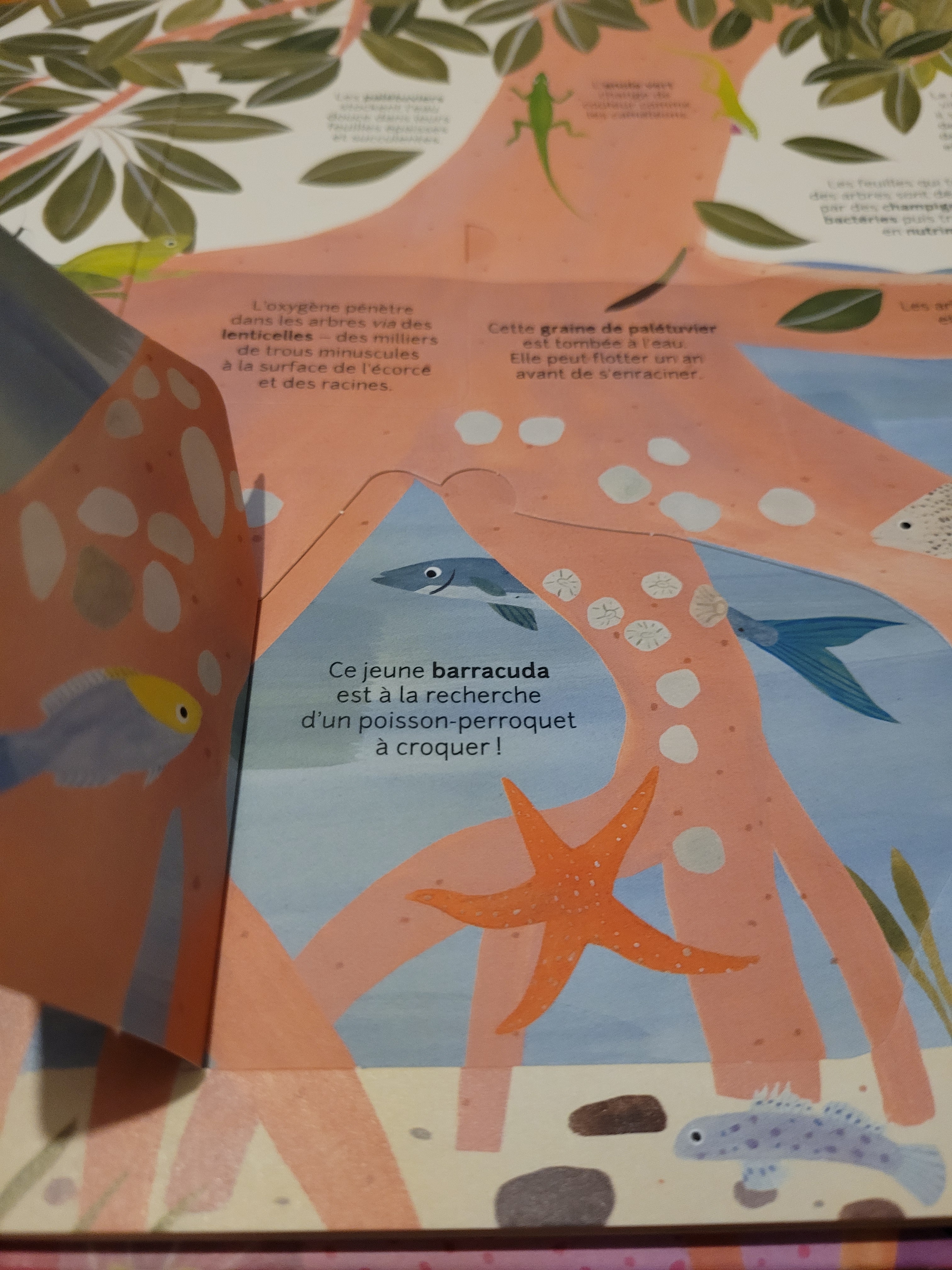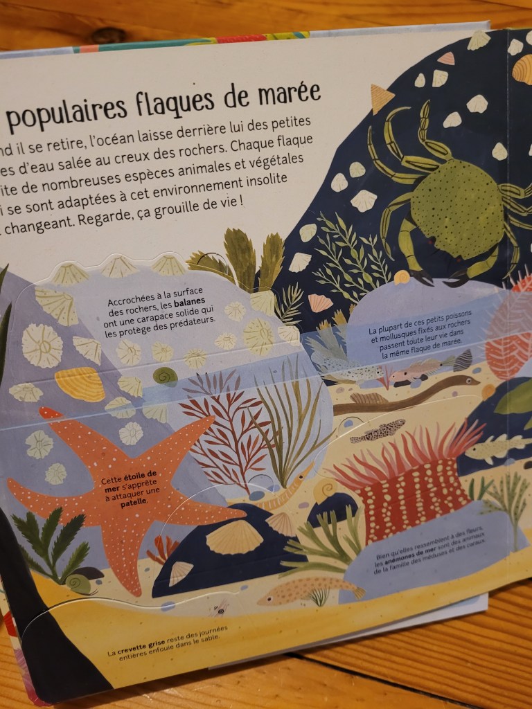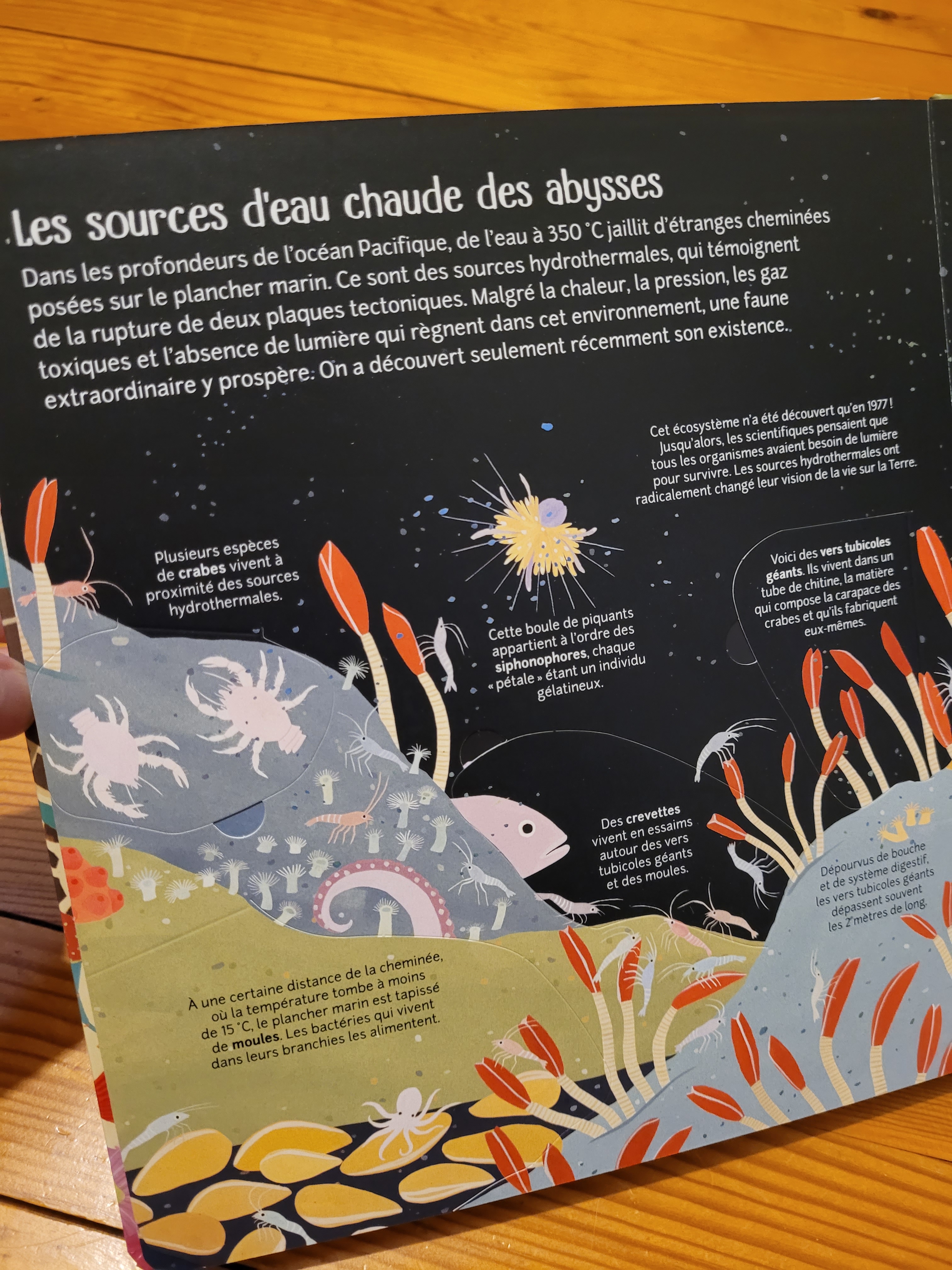 Ce documentaire s’inscrit dans la même série que Les petits monde de la terre que nous avions adoré. Ici direction les profondeurs à la découverte de toute la vie qui peut exister sous l’eau. Comme le précédent documentaire on retrouve à l’intérieur 70 flaps qui rendent le livre encore plus ludique et attractif pour les enfants. L’album est extrêmement riche en connaissances. Enfin j’ai beaucoup aimé les illustrations qui sont très douces et délicates. Bref ce nouveau documentaire est encore une fois un succès.