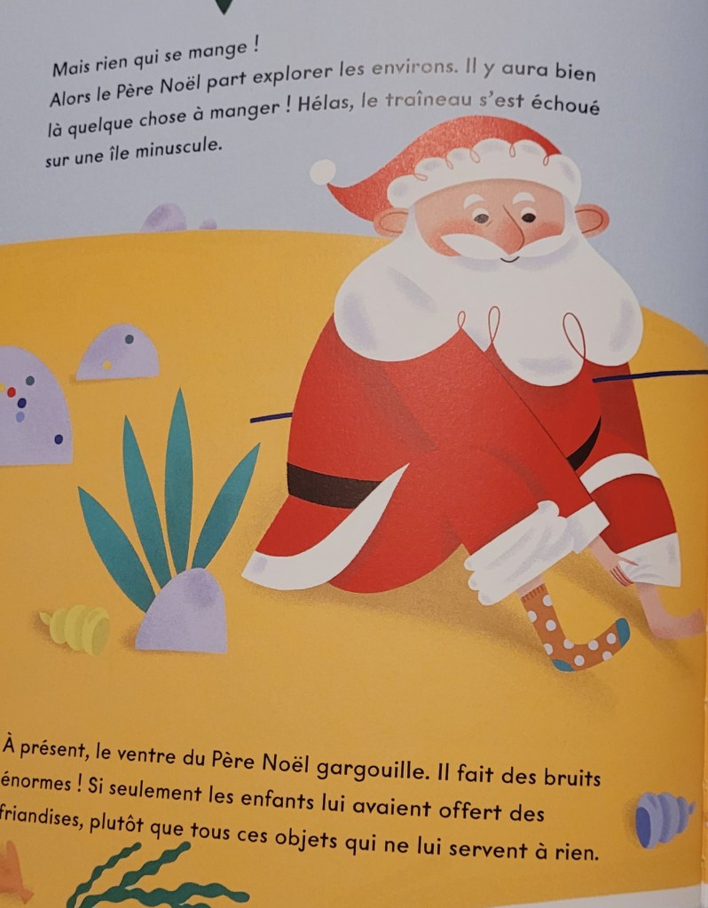Personnellement je suis peut être un peu moins fan des illustrations car je suis très attachée aux illustrations traditionnelles dans les albums jeunesse mais les enfants aiment beaucoup car c’est très coloré et le Père Noël a une bouille adorable.